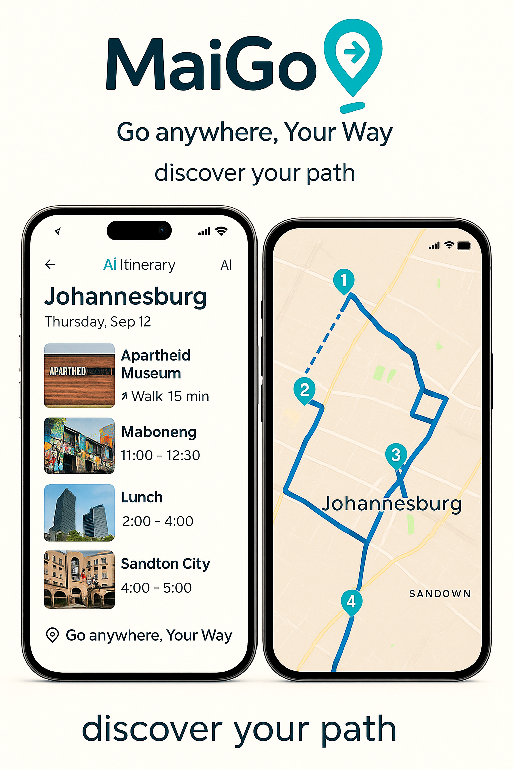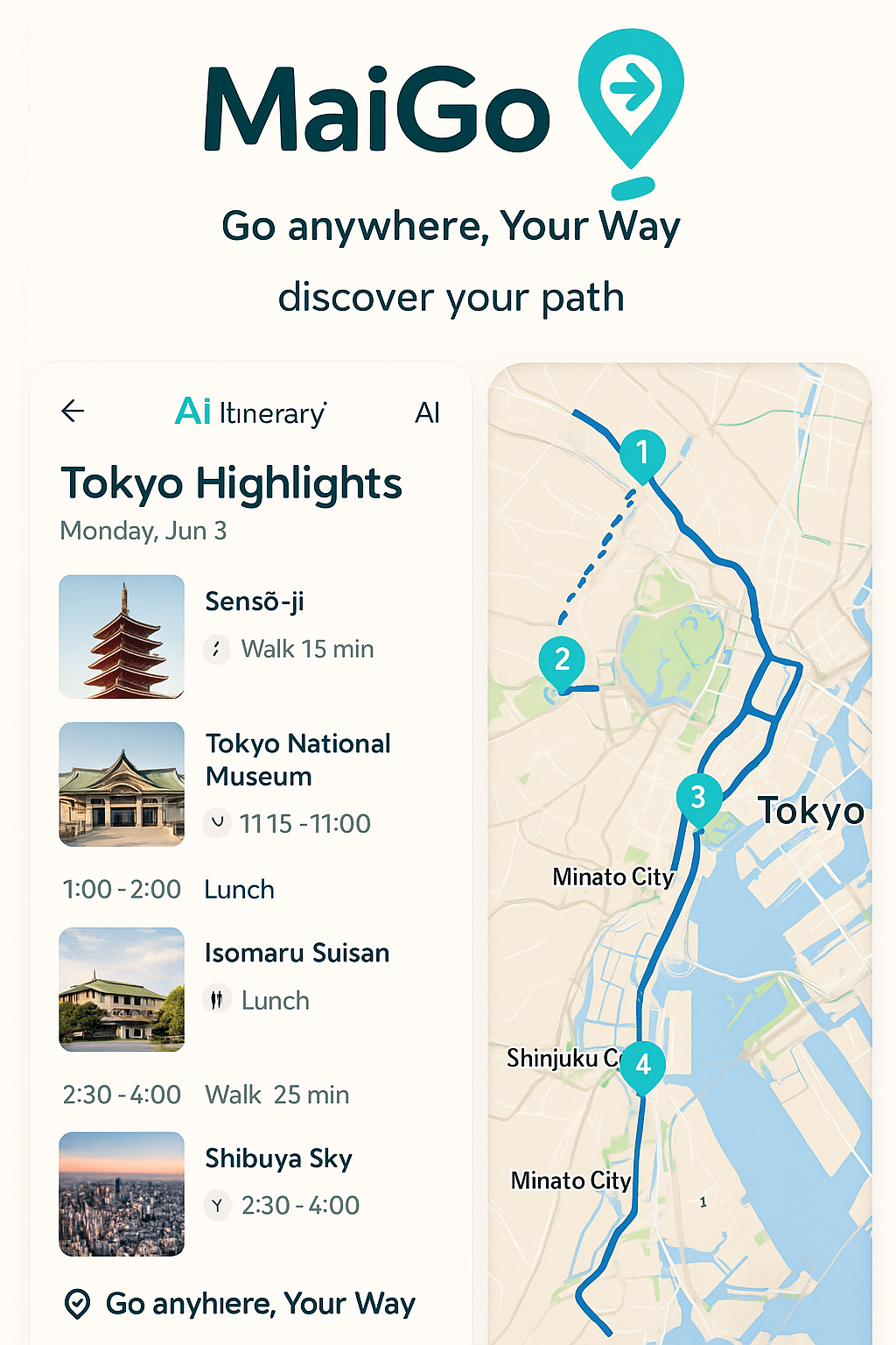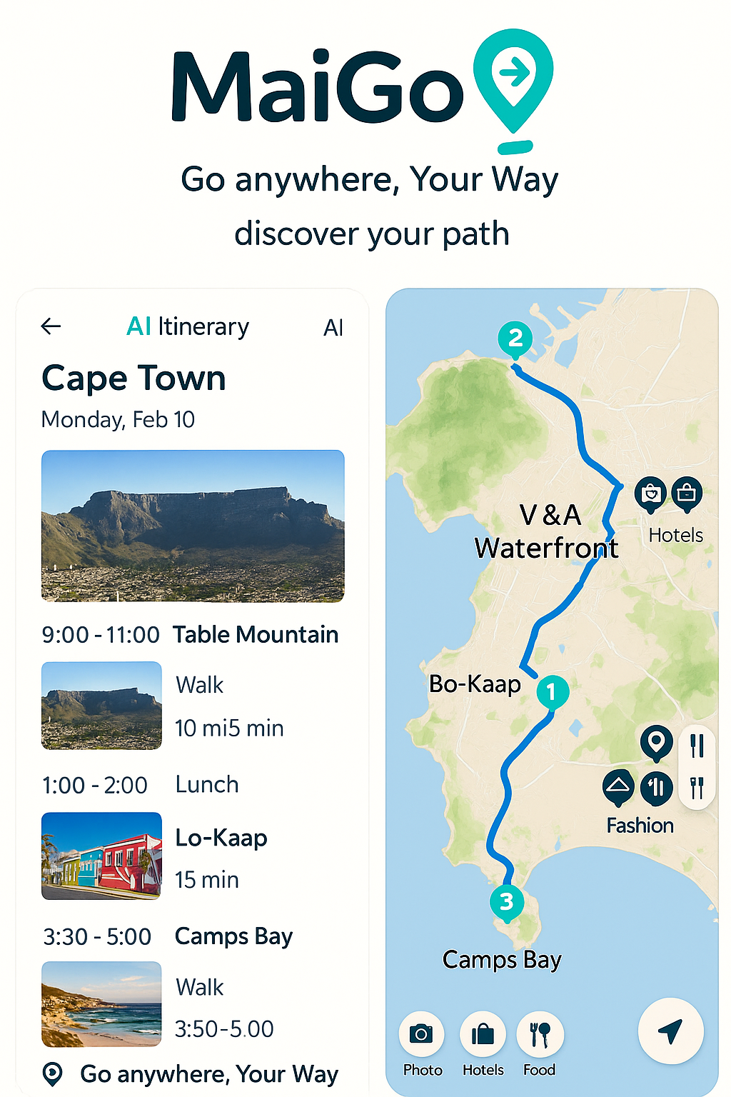 Itinerary Engine: Auto-generated, time-aware itineraries with travel times, opening hours, and buffers Modes of Transport: Walking, public transit, rideshare, car, flights