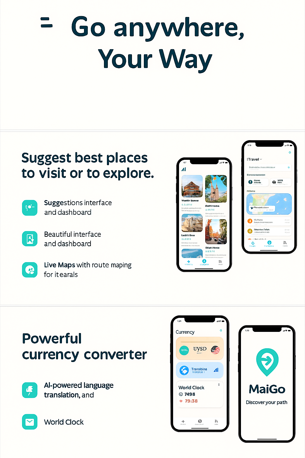 Utilities: Currency converter, AI-powered translation (text/voice), world clock Localization & Accessibility: Multilingual support, accessible design